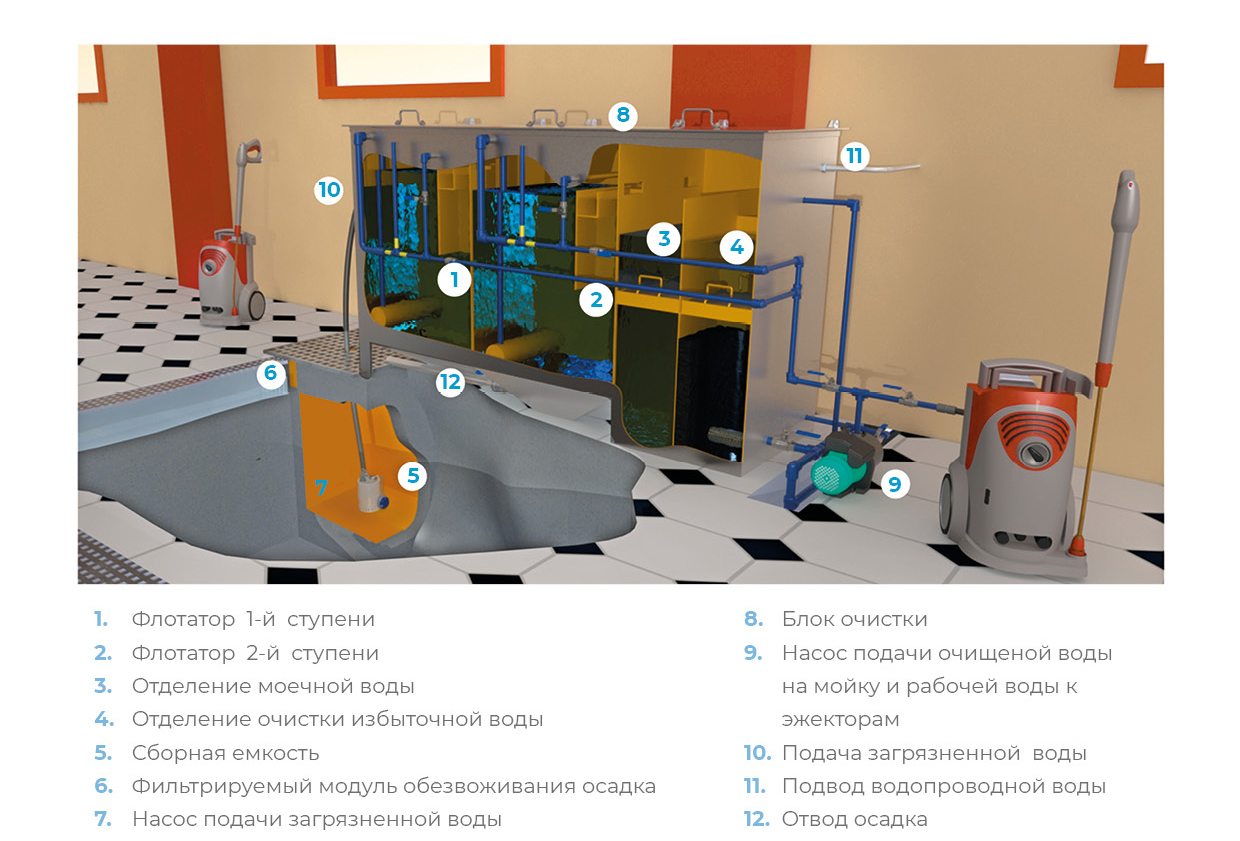Очищенные сточные воды поступают в емкость, встроенную в блок очистки, из которой перекачиваются на моечные посты. От напорной линии предусмотрено ответвление, для приготовления рабочей жидкости для флотатора. Водовоздушная смесь после эжектора подается во флотатор, где воздух растворяется в воде, а затем, выходит в виде мелких пузырьков, инициируя процесс выделения из воды растворяемых поверхностно-активных веществ и мелких частиц, образовывая на поверхности флотопену.